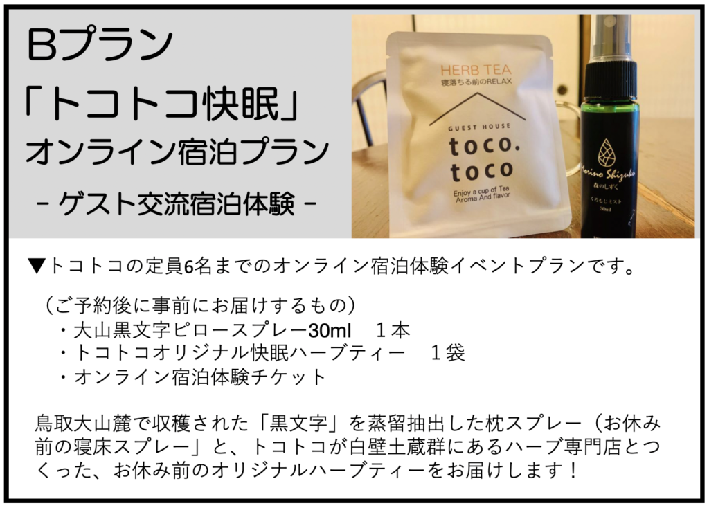 第1回目のオンラインイベントは、「おもしろがろう、鳥取」さんの企画内で、トコトコのオンライン宿泊体験をスタートします。