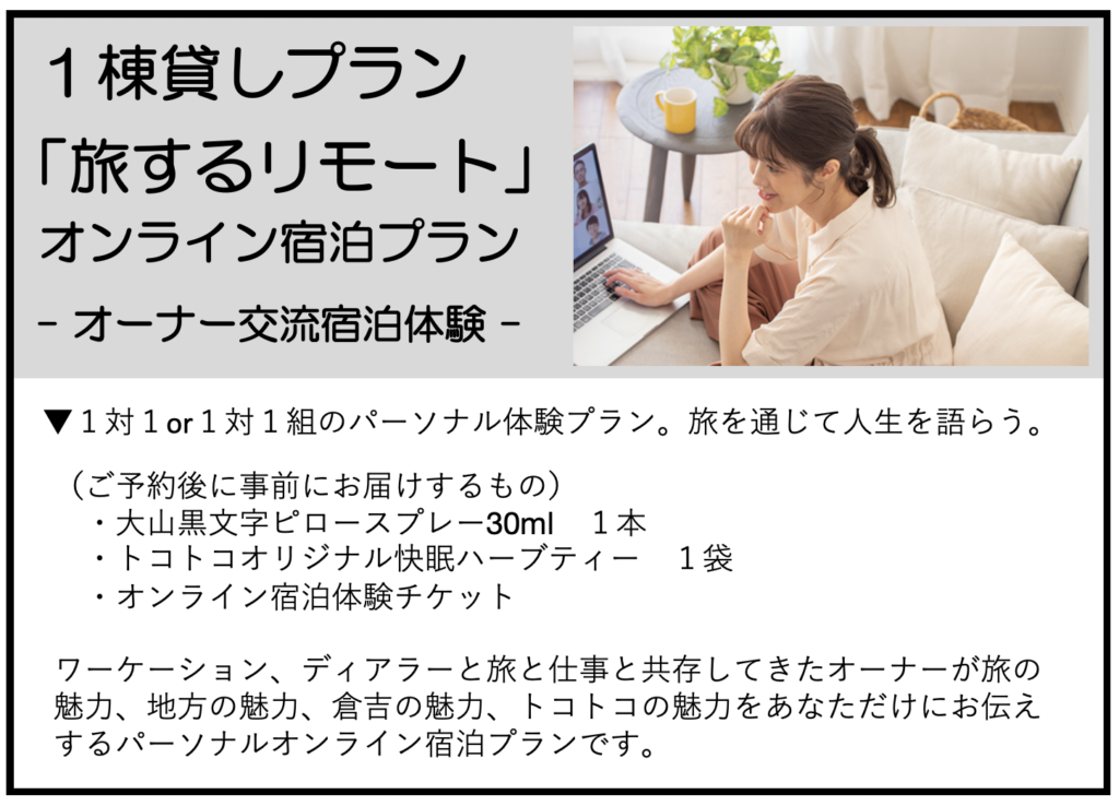 オンライン「1棟貸し滞在」プランでは、トコトコの宿泊と同じく、1日1組限定で、あなたのためだけのオンライン宿泊が出来ます。倉吉の旅を10倍楽しむ観光地図には載っていない特別な場所をお伝えしたり、移住、2拠点居住、ワーケーションと色々な暮らし方、働き方をしてきたオーナーと、これからの旅や働き方など語らったり、相談したり、雑談したりと、パーソナルで楽しんでいただけます。プランは下記の内容です。ご予約は「じゃらん」よりお願いします。