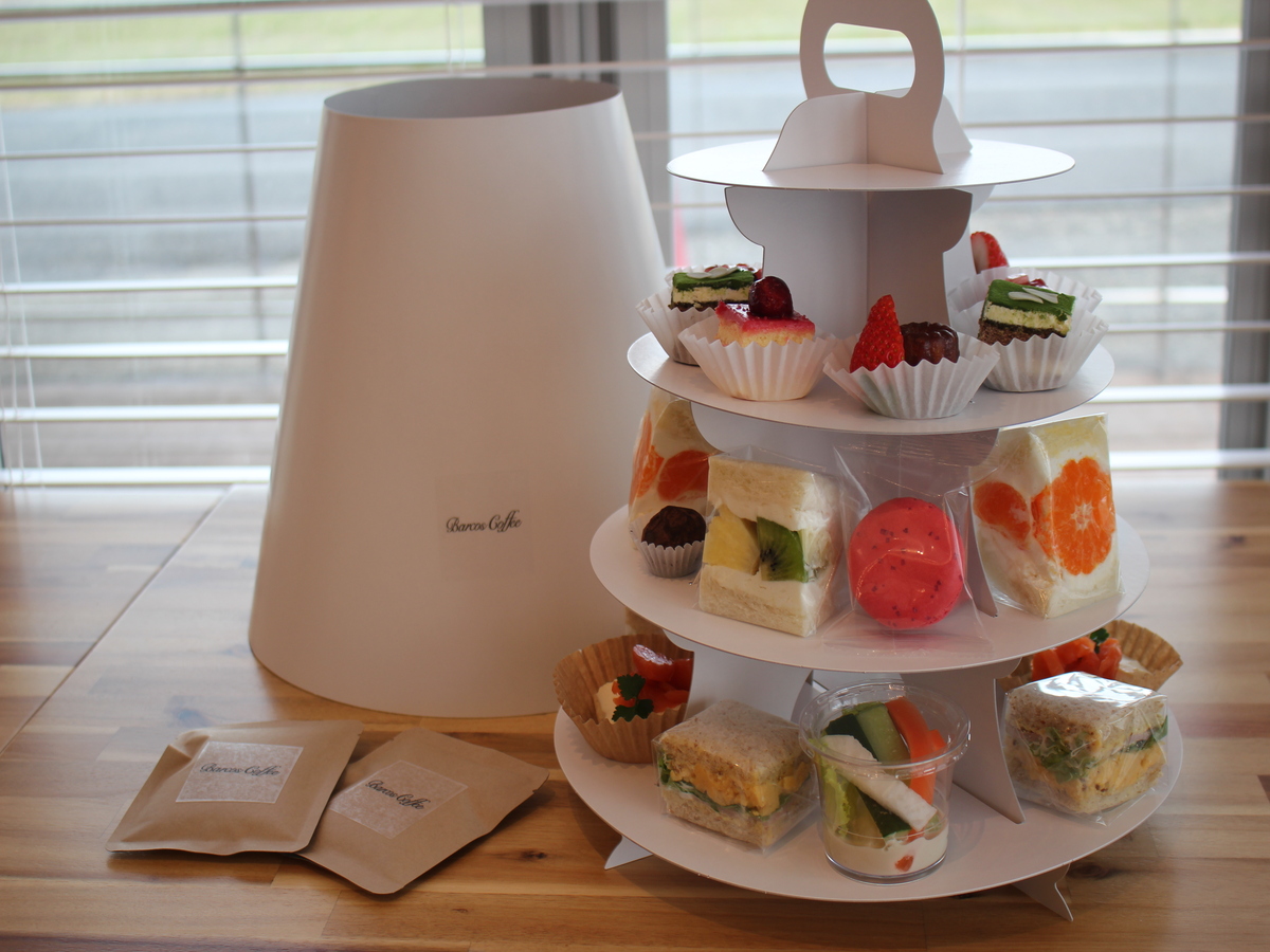 ①系列カフェよりテイクアウトアフターヌーンティーをお届けします。マカロンやカヌレ、フルーツサンドと人気アフターヌーンをお楽しみください。