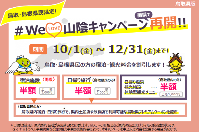 鳥取・島根の両県民を対象とした地元観光促進キャンペーン「#WeLove山陰キャンペーン」 こちらの、鳥取・島根にお住まいの皆様に、...